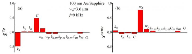 圖3展示了圖1的測量信號對系統中不同參數的敏感性系數。這些參數包括了傳感層和基底材料的不同方向上的熱導率kxm、kym、kzm(其中角標m表示為金屬傳感曾的物理性質)和kx、ky、kz,體積比熱容cm和c,金屬傳感層的厚度hm,界面熱導G,泵浦光斑樣品表面上不同方向上的激光光斑尺寸wx、wy。