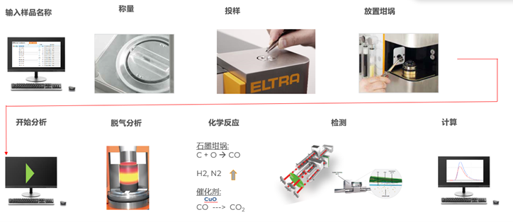 鋼鐵中氧氮?dú)湓氐闹髁鞯臏y(cè)試方式目前還是使用惰性氣體熔融法對(duì)樣品進(jìn)行分析。該方法的分析原理是:樣品中的氧氮?dú)湓卦诙栊詺怏w條件下,通過(guò)高溫加熱將氧氮?dú)湓蒯尫懦鰜?lái)。氧轉(zhuǎn)化為CO和CO2混合物,催化劑將其中的 CO 氧化成CO2。通過(guò)紅外檢測(cè)池測(cè)出CO2 的含量從而推算出氧的含量,N和H的含量則以N2和H2的形式,通過(guò)熱導(dǎo)檢測(cè)器測(cè)出。