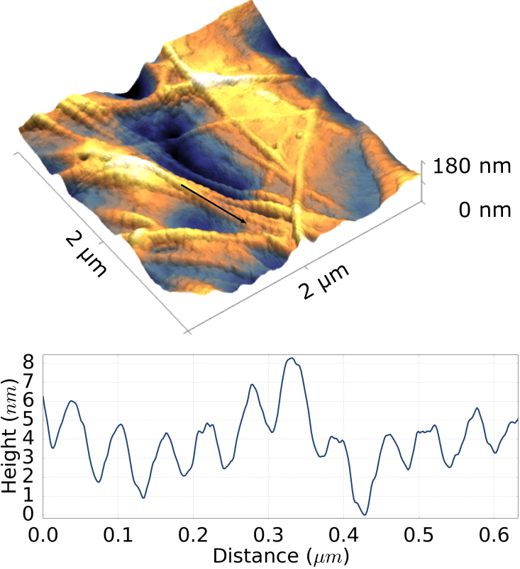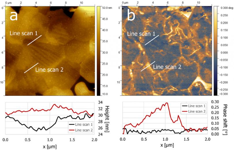 在3V的電壓下FusionScope的a)原子自理顯微鏡(Atomic Force Microscopy, AFM)對樣品形貌的成像效果和b) 靜電力顯微鏡(Electrostatic Force Microscopy, EFM)下相同電壓且同***區域的成像結果