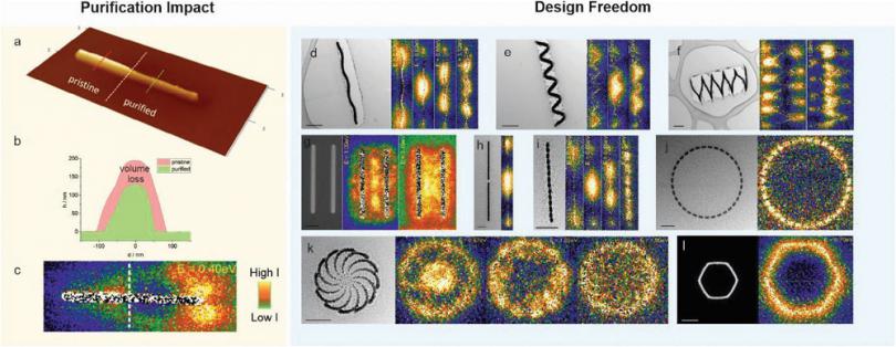 不同平面結構的等離子體測量結果。(a)為利用FusionScopeTM的原位AFM測量的在制備后和清除后的微納結構變化區別。(b)為通過原位AFM測量的在去除前后所制備納米結構的體積變化。(c)為部分去除樣品的STEM-EELS能譜。(d-l)為不同設計下的等離子體測量結果