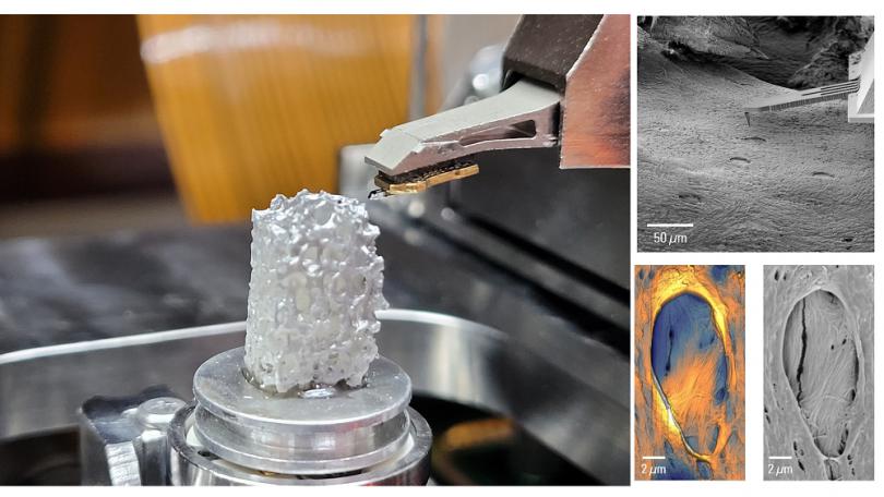 人工骨骼樣品放置在FusionScope的樣品臺上。右方為FusionScope對人工骨骼的特定區域進行三維表征