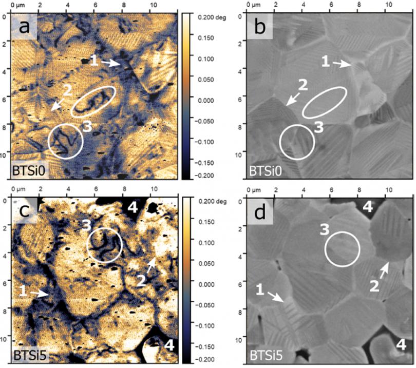 通過FusionScope獲得的(a)SiO2含量為0%和(c)SiO2含量為5%的BaTiO3陶瓷樣品的EFM結果。(b)和(d)為(a)和(c)同***微區的背散射電子成像結果