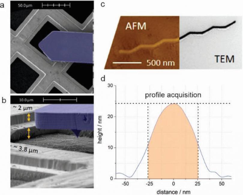 利用FusionScopeTM獲取用于模擬的數據。(a-b)在FusionScopeTM中利用SEM對AFM進行引導,在放置在TEM網格上的Au納米線進行測量。(c)對FusionScopeTM所獲得的數據和TEM所獲得的數據進行相互驗證。(d)FusionScopeTM測量Au納米線的高度為24 nm,半峰寬為51 nm