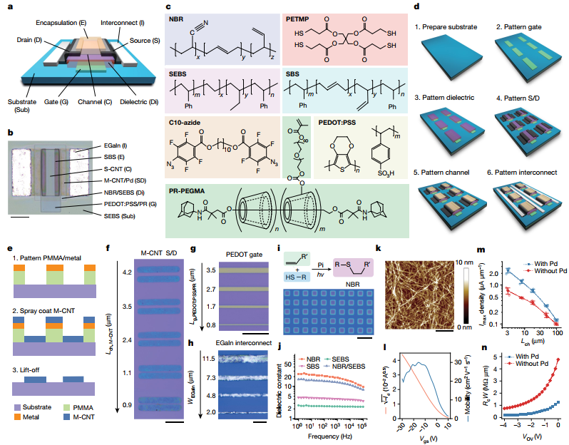 圖2. 本征可拉伸電子器件通過光刻進行制備的流程圖。a)示意圖和b)本征可拉伸電子器件的實物圖;c)用于制備可拉伸電子器件的材料的示意圖;d)可拉伸電子器件的制備過程;e)制備圖案化碳納米管的流程示意圖;f)圖案化的碳納米管;g)PEDOT門;h)EGaln導線;i)絕緣層;j)絕緣層材料的絕緣特性;k)碳納米管的AFM;l)碳納米管傳感器的場效應電子遷移率;m)在有無Pd納米顆粒條件下的大規模真核特性;n)有無Pd條件下的接觸電阻。