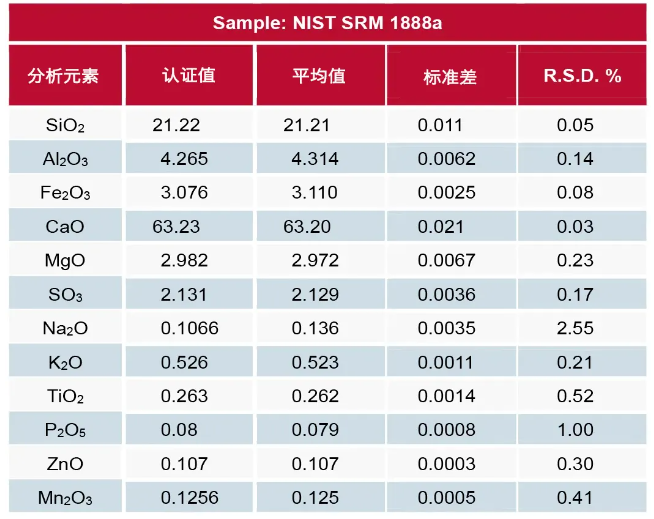 對波特蘭水泥的七個 NIST SRM 進行了定量分析。結果見上圖與 ASTM C114-18 的要求進行比較。結果證明符合 ASTM C114-18 的要求。