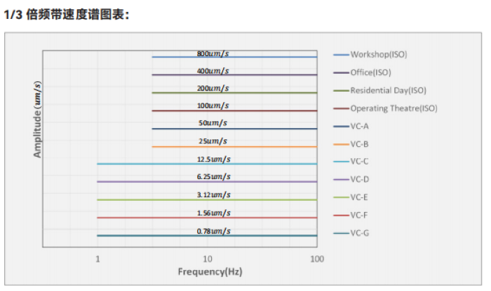 為了作出區分,人們進行了很多的研究,并且發現,根據頻率的不同,設備所作出的位移響應雖然不同,然而速度響應幾乎是相同的。因此,為了規定各種活動以及對于設備所允許的振動***標準,通常使用 1/3 倍頻帶速度譜。這***標準曲線的優點是能夠表示用速度的有效值來表達出振動,而非用位移或加速度來表達,以及如果設備種類相同,性能開始受影響的速度值也基本相似。
