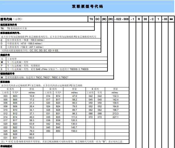 美***丹尼遜Denison公司,生產銷售的丹尼遜柱塞泵有以下幾大類型可供選擇:1、PV系列和PVM系列:螺紋連接式,進出油口在尾部,PV:工業用,PVM:行走機械用(高速)。2、PVT和PVR系列:開式回路用泵,側面油口,4螺栓,SAE法蘭連接,尾驅動備選,PVT:工業用,PVR:行走機械用(高速)。3、Premier 相系列:開式回路用泵,公制尺寸,(全功率)尾驅動備選。4、Worldcup 杯系列:開式回路用泵,尾驅動備選。5、Goldcup金杯系列:閉式回路用泵,控制功能集成化,(全功率)尾驅動備選,其他型式2備選。DENISON生產銷售的丹尼遜葉片泵有以下幾大類型:1、中等載荷:單聯TB系列。2、工業用及行走機械用:單聯T7B(S),T6C,T6D,T6E 系列。雙聯T7BB(S),T67CB,T6CC,T67DB,T6DC,T6DDS,T67EB,T6EC,T6ED 系列。三聯T67DBB,T67DCB,T6DCC,T67DDBS,T6DDCS,T67EDB(S),T6EDC(S) 系列。單聯尾驅動T6CR,T6DR,T6ER 系列。雙聯尾驅動T6EE(S) 系列。三聯尾驅動T6DCCR, T6EDCR 系列。3、混合型:雙聯T6H20B,T6H20C,T6H29B,T6H29C,T6H29D 系列。