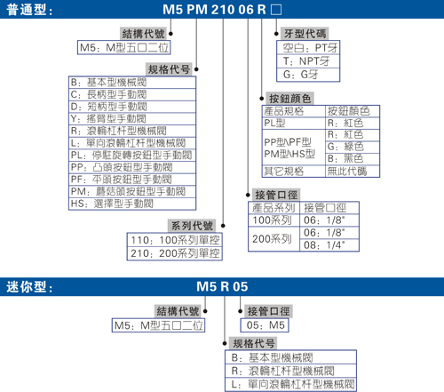 2) M5B、M5C、M5D、M5PM、M5PF、M5PP 系列為自動(dòng)復(fù)位。M5Y、M5HS、M5PL手動(dòng)閥為手動(dòng)復(fù)位。其中M5PL押入定位后,須旋轉(zhuǎn)旋轉(zhuǎn)鈕才能復(fù)位。