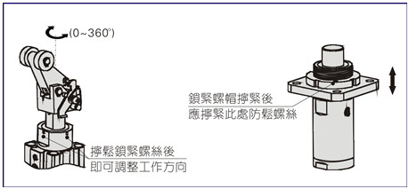 3.1、當(dāng)本體固定,僅調(diào)整止轉(zhuǎn)墊方向即可改變阻擋氣缸的工作方向。