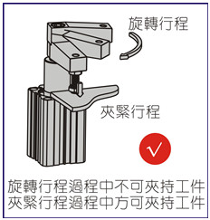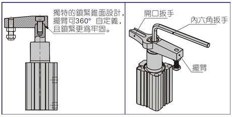 8.2、拆裝夾緊擺臂時(shí),按右圖方式,以開口扳手、內(nèi)六角扳手來鎖緊或拆卸;不可固定本體來進(jìn)行拆裝鎖緊螺栓,這樣易破壞內(nèi)部零件而無法使用;