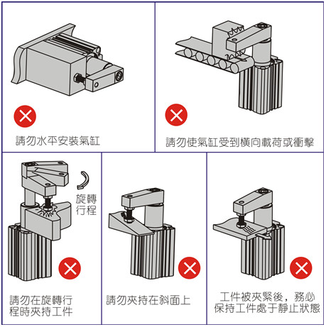 6、為確保氣缸的正常工作及使用壽命,請(qǐng)按下圖所示方式正確使用氣缸;