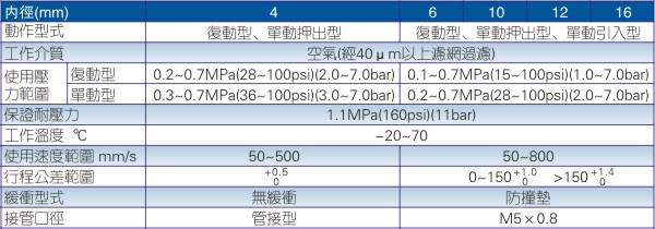7、Φ4缸徑氣缸負載須與氣缸同軸,避免側向負載,否則活塞桿會彎曲變形且損壞桿端螺紋。單動型不可在回程時加載;