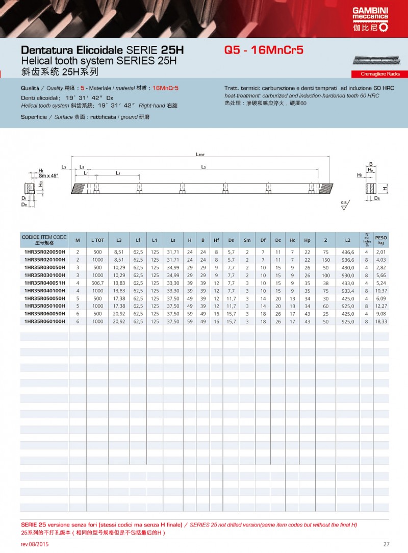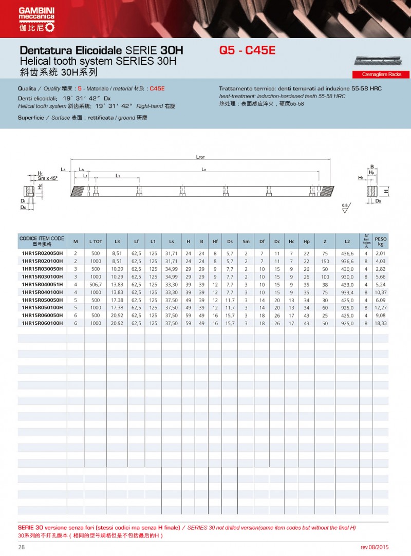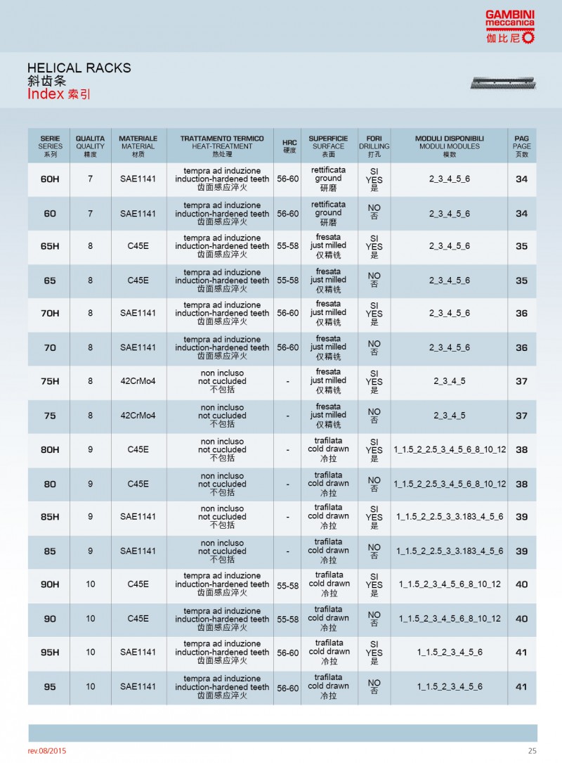 Gambini可使用不同類型的原材料生產(chǎn)高精度的直齒條和斜齒條。我們生產(chǎn)的齒輪齒條模數(shù)范圍為M0.5到M42,品質(zhì)等 范圍Q5到Q10。品質(zhì)等 Q5的齒條長度為1000mm,如果品質(zhì)等 為Q6,可生產(chǎn)的單件長度可達2000mm。Gambini高精度的齒條和齒輪廣泛應(yīng)用激光切割;CNC機床、三坐標測量儀、 七軸機器人等.產(chǎn)品有多種不同類型的熱處理方法。市面上***常使用和要求加工的是感應(yīng)淬火齒條和表面硬化和感應(yīng)淬火的齒輪。當然,我們也生產(chǎn)不需要熱處理的產(chǎn)品(所有我們的型號)。通過特殊研究,我們也可生產(chǎn)保護工件(防腐蝕和防磨損)的不同類型的表面處理;也可進行特殊上色和表面彩色處理。