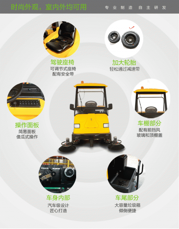 三輪電動清掃車性能特點:加大底盤設計,工作效率高,實心加大輪胎,輕松過減速帶,整車通過性好。大型粉塵過濾器,可完全清理灰塵,電動震動器可以自動清潔過濾網。采用 進的高性能免維護蓄電池,不漏液,不產生有害氣體,可選配鋰電清掃車。該機擁有 進的清掃拋甩技術,塵箱利用率高。全LED大燈,高壓霧化降塵系統,避免二次揚塵。可靠的電控系統,過流、欠壓保護;行車系統具有坡道行走保障功能。可選配PFC充電機。