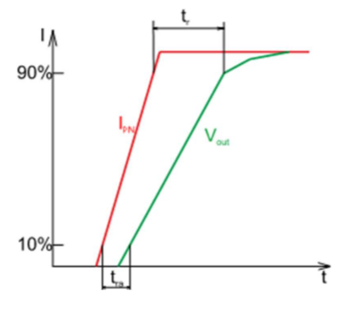 tr響應時間,測量為矩形 次電流和輸出電流或電壓之間的IP=0.9*IPN時的延遲時間。