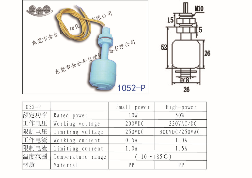 水位控制開關1052-P、水位信號開關、水位傳感開關 浮球開關 液位開關是 種結構簡單、使用方便、安全可靠的液位控制器件, 般接到繼電器或者交流接觸器的。當水位、油位上升/下降到 定距離時,感應開關就閉合或者斷開,隨著繼電器/交流接觸器也跟著閉合或者斷開,從而控制水泵、水位、油位。