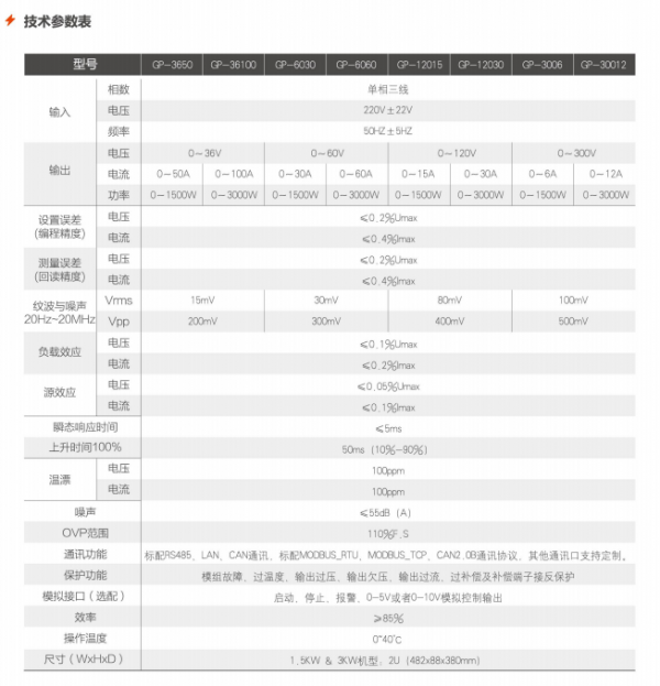GP(1~3KW)系列直流穩壓電源技術參數表: