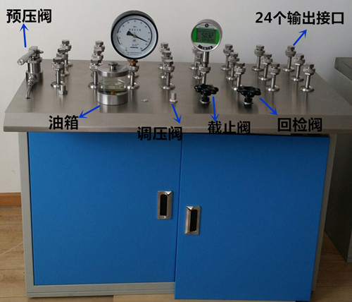 SD-318多輸出口壓力校驗臺由調壓閥,回檢閥,預壓閥和截止閥,多個壓力輸出接口組成,整體固化結構,樣式新穎,操作簡單,便于維護,具有密封性能好,升壓平穩,速度快,省力,操作簡單等優點。多輸出口壓力校驗臺,24個輸出接口, 次可檢同量程多塊壓力表,量大壓力檢定的好解決方案,大大提高工作效率,不同輸出接口可根據需要定制。
