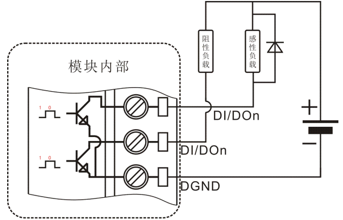 DAM-6081模塊開(kāi)關(guān)量輸出采用NPN三 管集電 開(kāi)路輸出,輸出有效電平為低電平;當(dāng)對(duì)相應(yīng)端口寫(xiě)“0”時(shí)輸出有效,三 管導(dǎo)通;當(dāng)對(duì)相應(yīng)端口寫(xiě)“1”時(shí)輸出無(wú)效,三 管關(guān)斷。