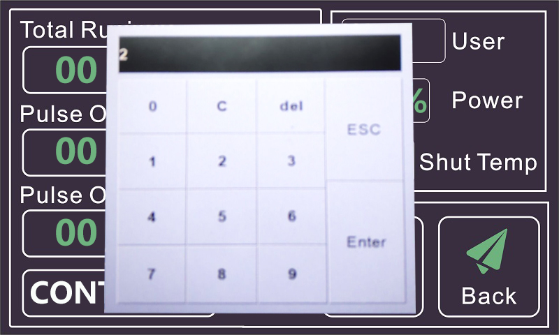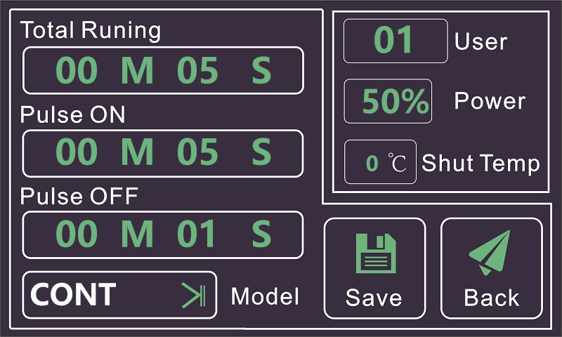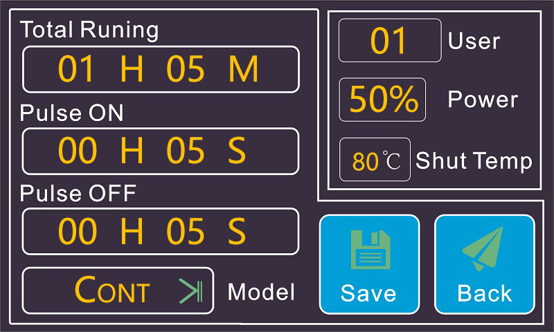運行時間、工作時間、停止時間、過載溫度及實時溫度、功率輸出比、工作模式、返回鍵、暫停