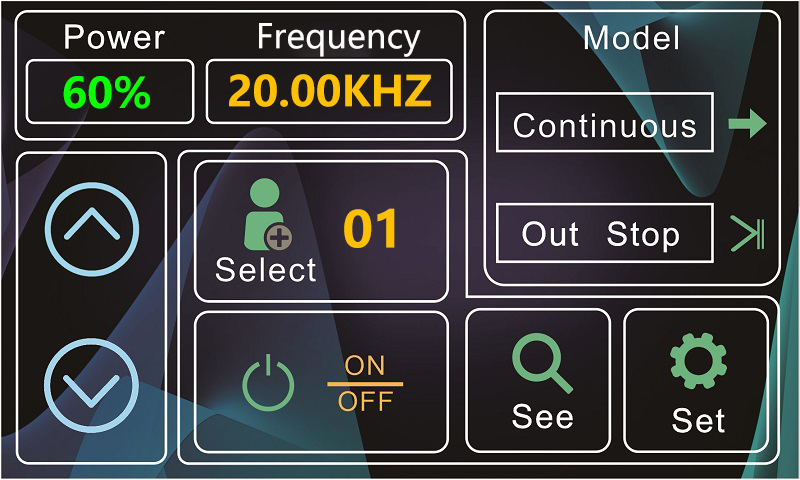 功率百分比、工作頻率、運行模式、用戶組、設定鍵、設備運行狀態、啟動/關閉、設備運行參數詳情鍵
