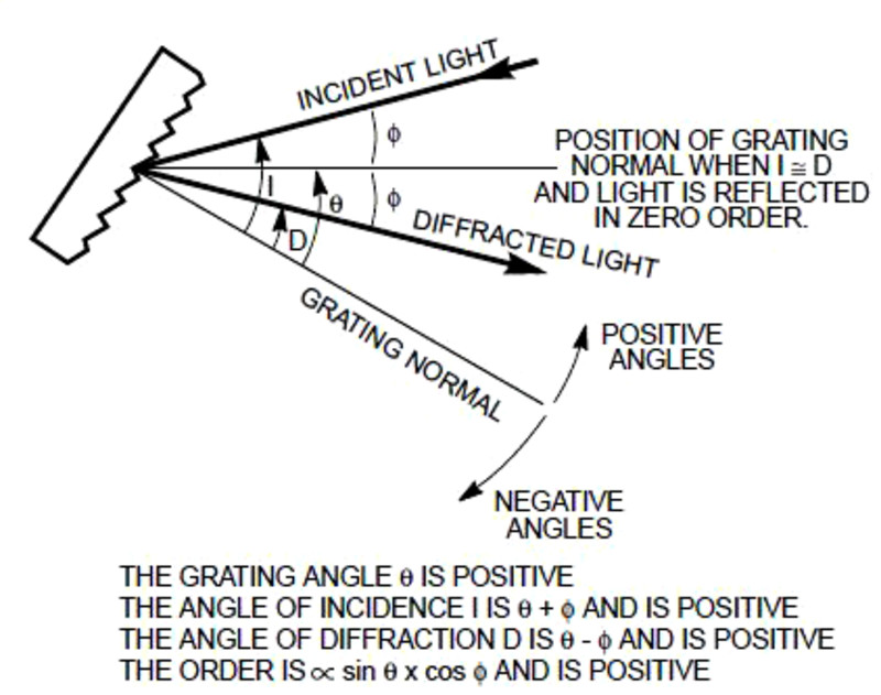 The above figure illustrates this diffraction. Light of wavelength λ is incident at an angle α and diffracted by the grating (with a groove spacing dG) along a set of angles βm. These angles are measured from the grating normal, which is shown as the dashed line perpendicular to the grating surface at its center. If βm is on the opposite side of the grating normal from α, its sign is opposite. In the equation, m is the order of diffraction, which is an integer. For the zeroth order (m = 0), α and β0 are equal and opposite, resulting in the light simply being reflected, i.e., no diffraction. The sign convention for m requires that it is positive if the diffracted ray lies to the left (counter-clockwise side) of the zeroth order and negative if it lies to the right (the clockwise side). When a beam of monochromatic light is incident on a grating, the light is simply diffracted from the grating in directions corresponding to m = -2, -1, 0, 1, 2, 3, etc. When a beam of polychromatic light is incident on a grating, then the light is dispersed so that each wavelength satisfies the grating equation as shown in the figure. Usually only the first order, positive or negative, is desired and so higher order wavelengths may need to be blocked. In many monochromators and spectrographs, a constant-deviation mount is used where the wavelength is changed by rotating the grating around an axis while the angle between the incident and diffracted light (or deviation angle) remains unchanged.