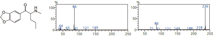 隸屬于的鹽酸鹽標準品(3,4-亞甲基雙氧苯基甲胺戊酮)的EI質譜圖(左)與CI質譜圖(右)