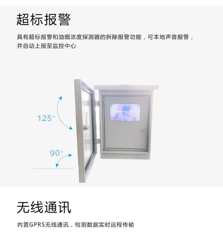 是可實(shí)現(xiàn)油煙排放濃度實(shí)時(shí)監(jiān)測(cè)的儀器,其主要由構(gòu)成由采集器主體、顯示屏、油煙探頭三部分。內(nèi)置物聯(lián)網(wǎng)3G/4G模塊,采用實(shí)時(shí)在線、自動(dòng)上傳的方式工作。采集器帶有油煙探頭專(zhuān)用接口,用于連接探頭。采集器通過(guò)控制探頭采集油煙原始數(shù)據(jù),讀取探頭采集到的原始數(shù)據(jù),并進(jìn)行計(jì)算,*終得到油煙濃度值,可以在顯示屏上直接讀取數(shù)據(jù)。油煙在線監(jiān)控系統(tǒng)由實(shí)時(shí)數(shù)據(jù)監(jiān)測(cè)、歷史數(shù)據(jù)查詢、基礎(chǔ)信息管理、用戶信息管理等幾部分功能組成。