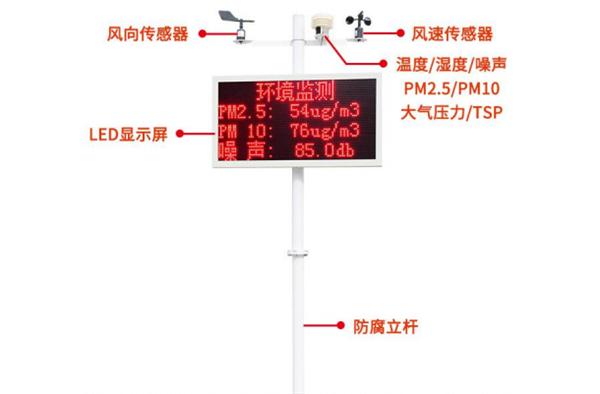 噪聲揚塵監測站是專門針對在建工程項目的監測設備。該設備具有 1 路百葉盒(溫度、 濕度、噪聲、PM2.5、PM10、氣壓、TSP)采集、1 路風速采集、1 路風向采集、1 繼電器 輸出(默認可接現場二***繼電器控制霧炮)、1 路 485 從站輸出;該設備可通過 GPRS 方式 將數據上傳監控軟件平臺,同時該主機能夠外接 1 路 LED 屏(54cm*102cm)實時顯示當前 數值信息。