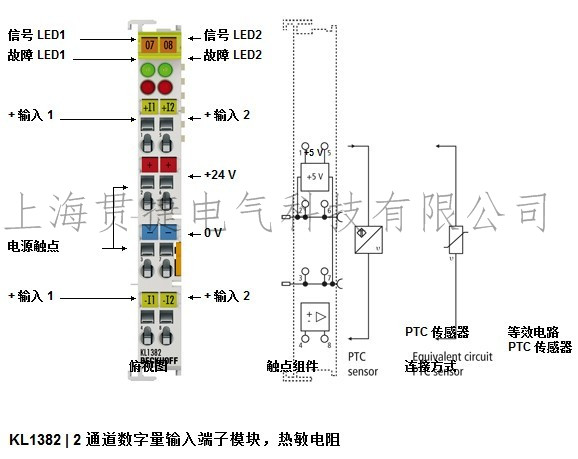 數字量輸入端子模塊 KL1382 借助電流回路和低于 5 V 的電壓分析熱敏電阻傳感器的輸入信號。KL1382 是 種用于 PTC 傳感器熱機保護的監控設備,適用于對電機、軸承以及其它設備進行直接監控。在過程映像中, 個位指示傳感器的狀態,另 個位報告短路或斷線情況。紅色或綠色 LED 指示兩個輸入位的狀態。