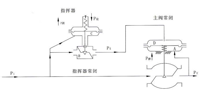 該閥采用 導式結構,有兩個薄膜執行機構(指揮器和主閥各 個)閥后壓力 不直接控制主閥芯,而是指揮器執行機構控制閥門主閥的開和關,原理如下:
